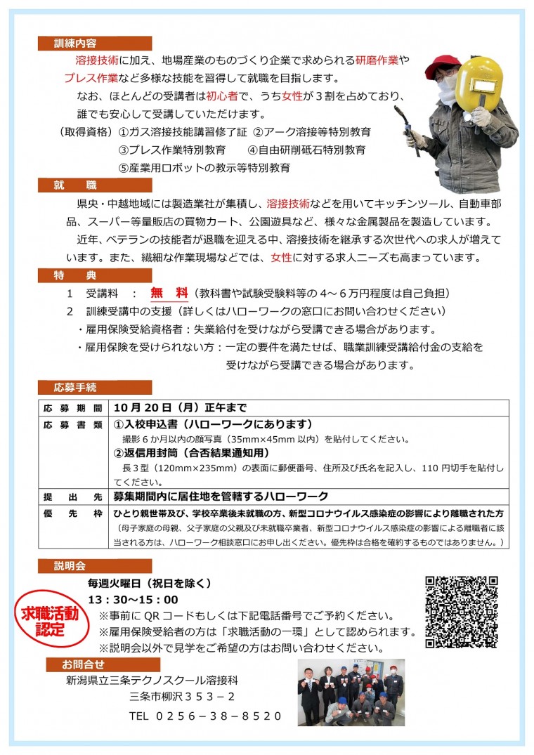 三条テクノスクール > 溶接科3期 【令和7年11月開講】訓練生追加募集中!