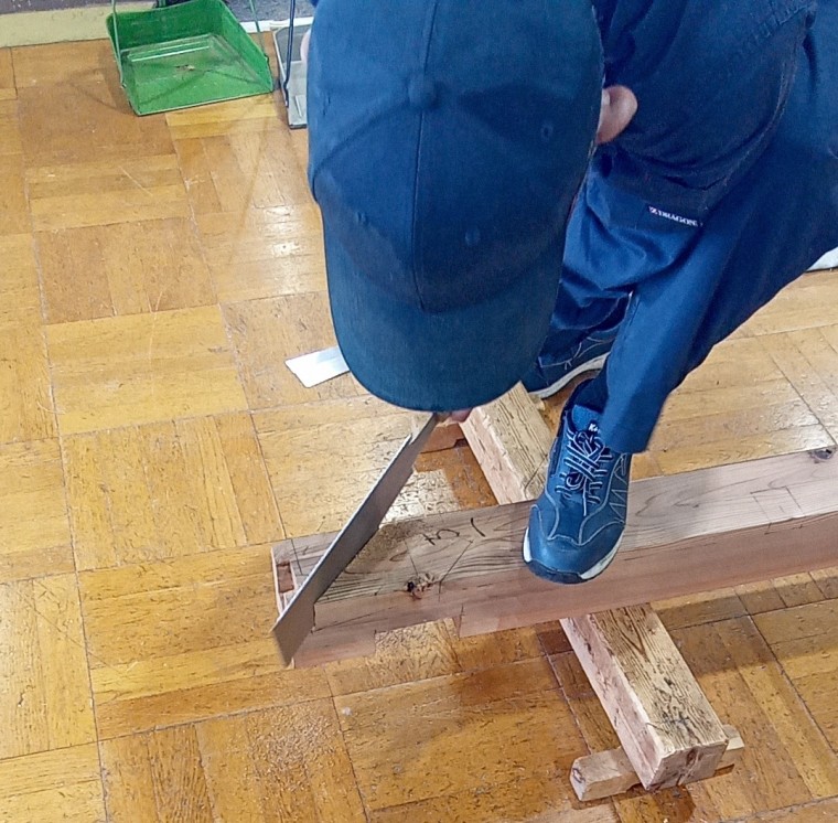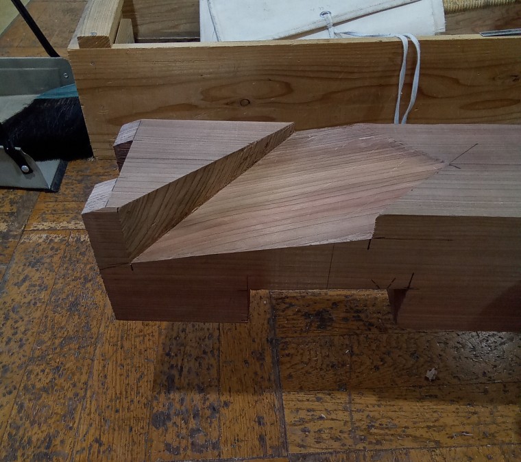 斜めに鋸を入れて、のみで勾配をつけて加工していきます。