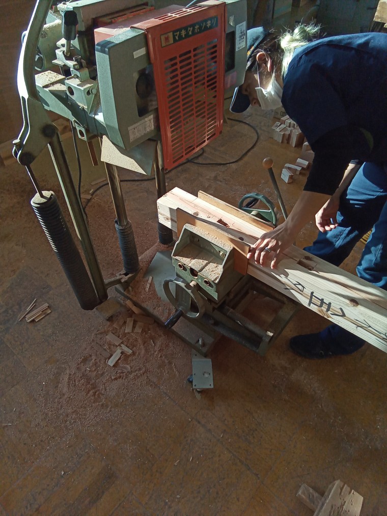 ほぞ取り機は、柱と梁を接合するための“ほぞ”を切り出す専用機械のことで、写真では、角材をセットし、墨付け通りにほぞを加工している様子が確認できます。