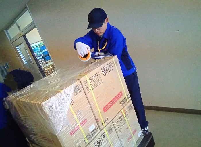 パレットの上に荷物を積み付けし、荷物が汚れない、運搬中に崩れないよう、ストレッチフィルム(ラップ)を使って固定します。ストレッチフィルムは保管、運搬など、物流現場では欠かせない資材です。