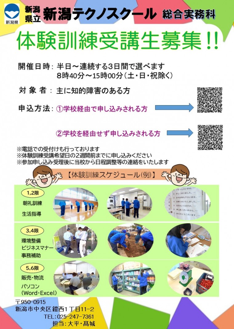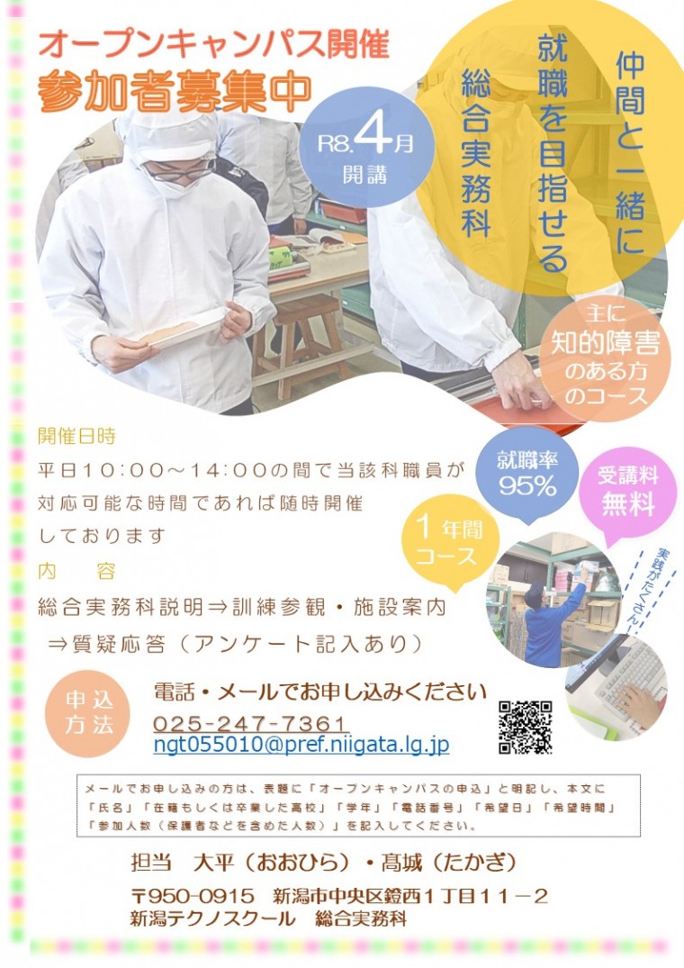 新潟テクノスクール総合実務科(主に知的障害のある方対象のコース)では『オープンキャンパス』参加者募集中です。
