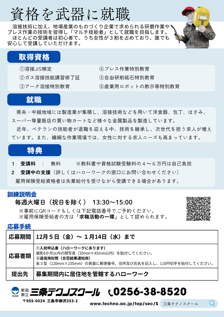三条テクノスクール > 溶接科4期 【令和8年2月開講】訓練生募集中!